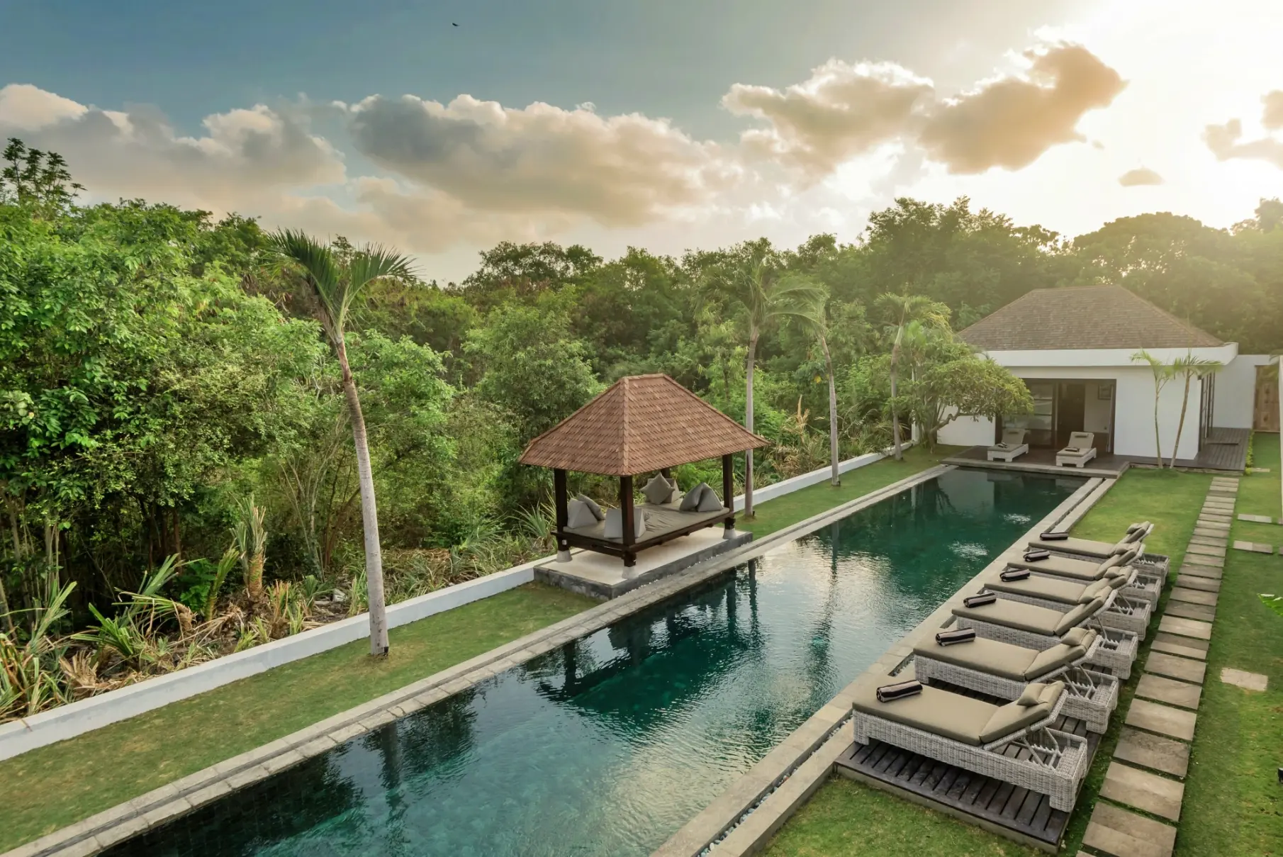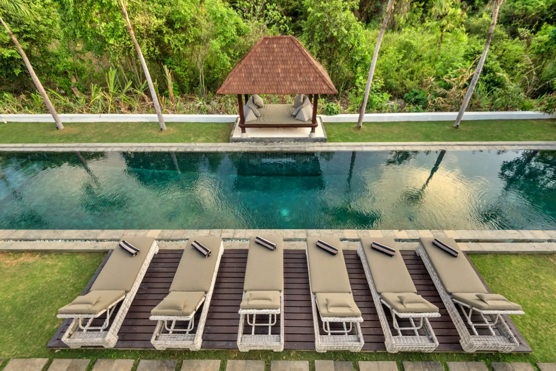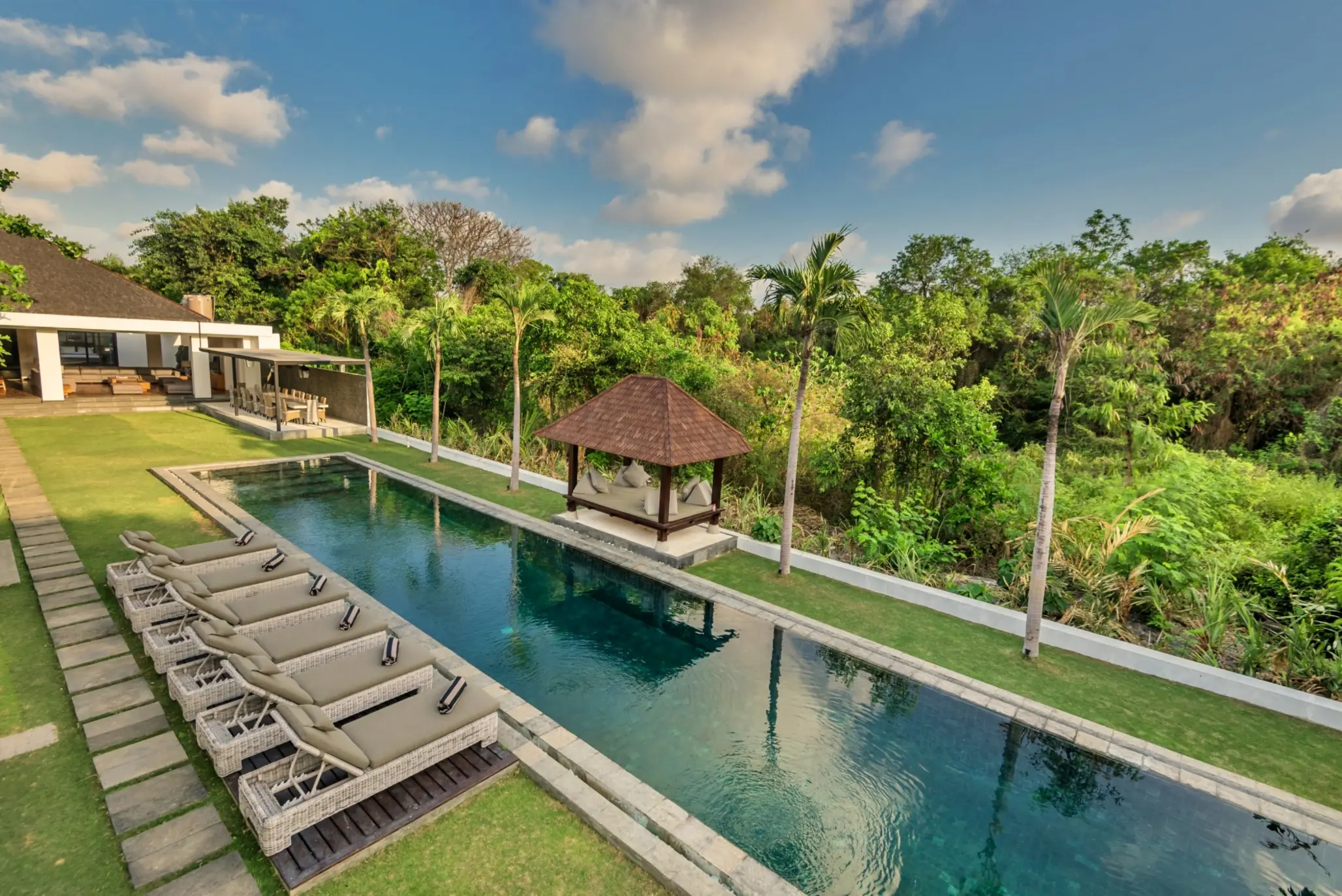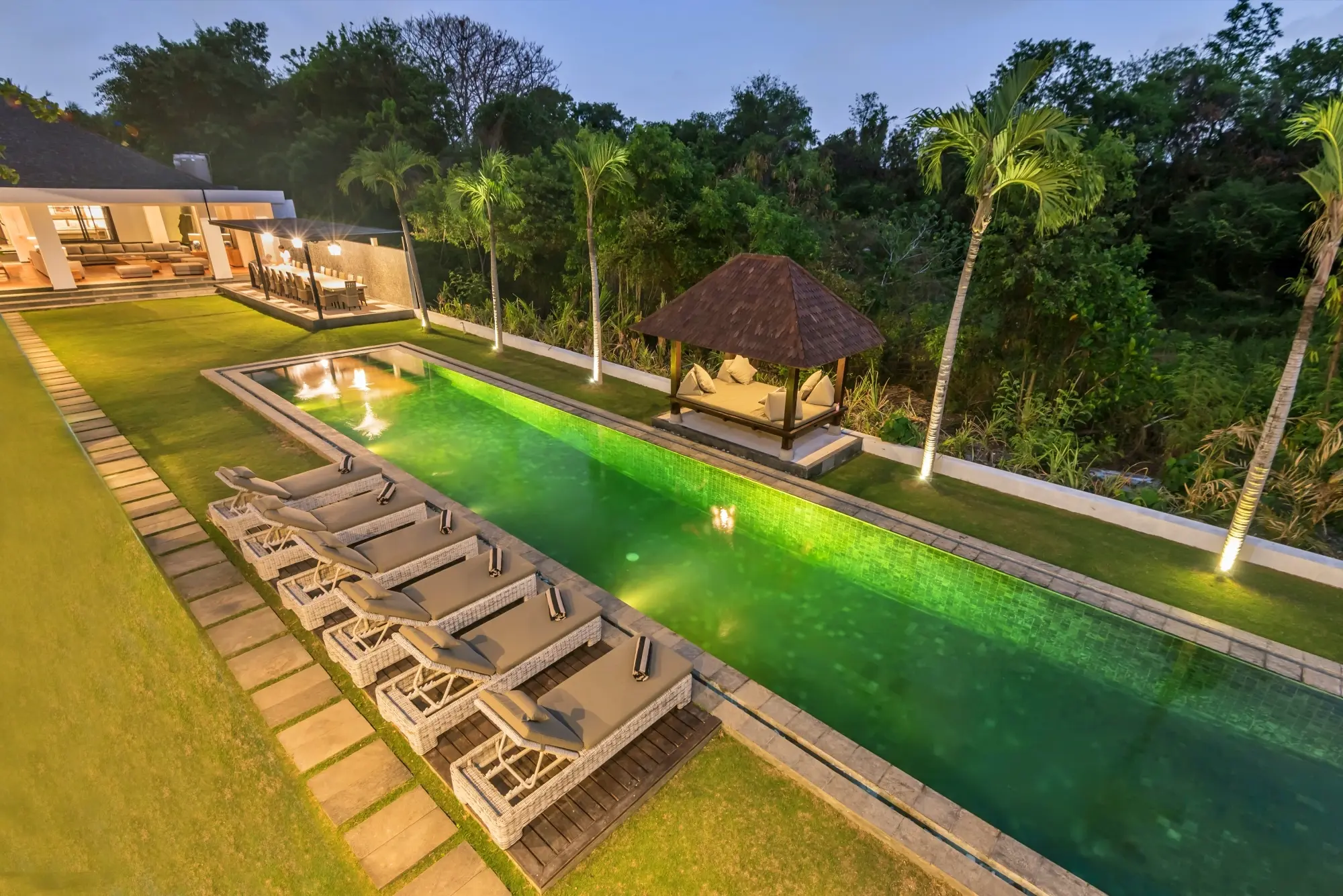 Close to world class beaches, shopping, eating and nightlife with some of Asia’s best restaurants, bars and nightclubs offering great value for your money. The villa estate has flexible accommodation with 11 bedrooms and 14 beds with air conditioning, 10.5 bathrooms with high quality vanity units/fixtures & fittings. There’s a large living, dining and entertainment area leading with a separate kitchen. A large swimming pool (child & non-swimmer friendly) is situated in the lush tropical garden area along with outdoor daybeds, entertaining and BBQ area. A BBQ is available for use.