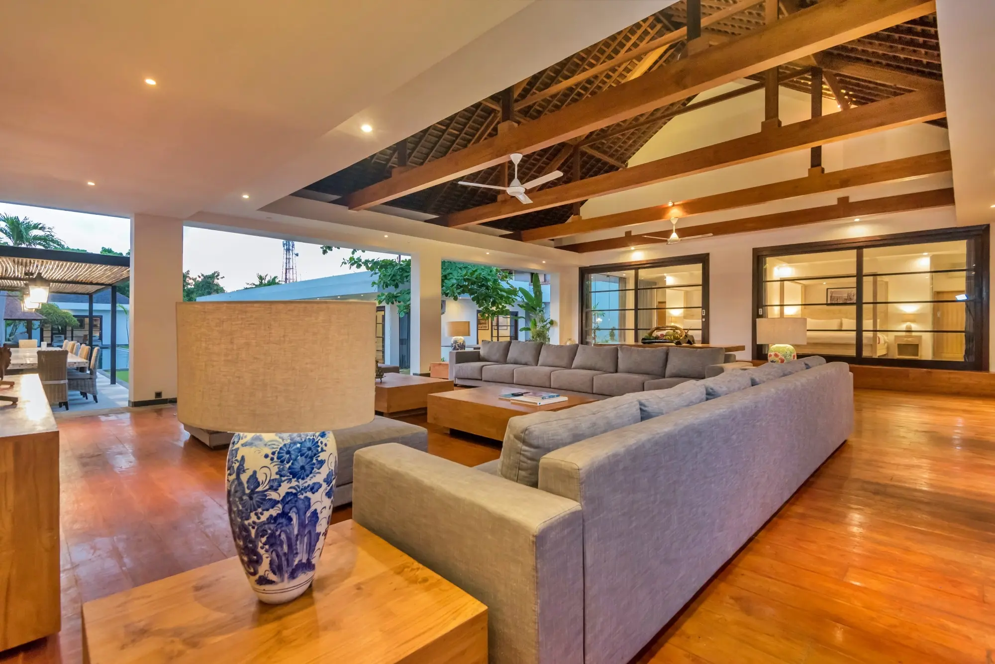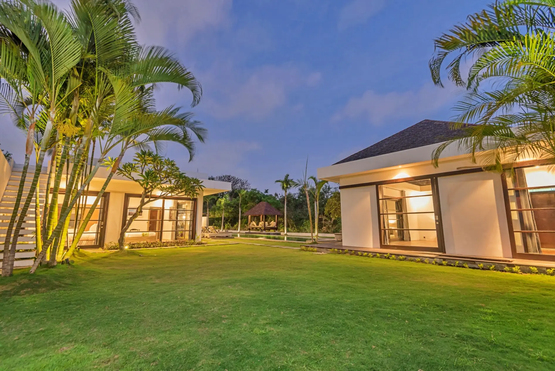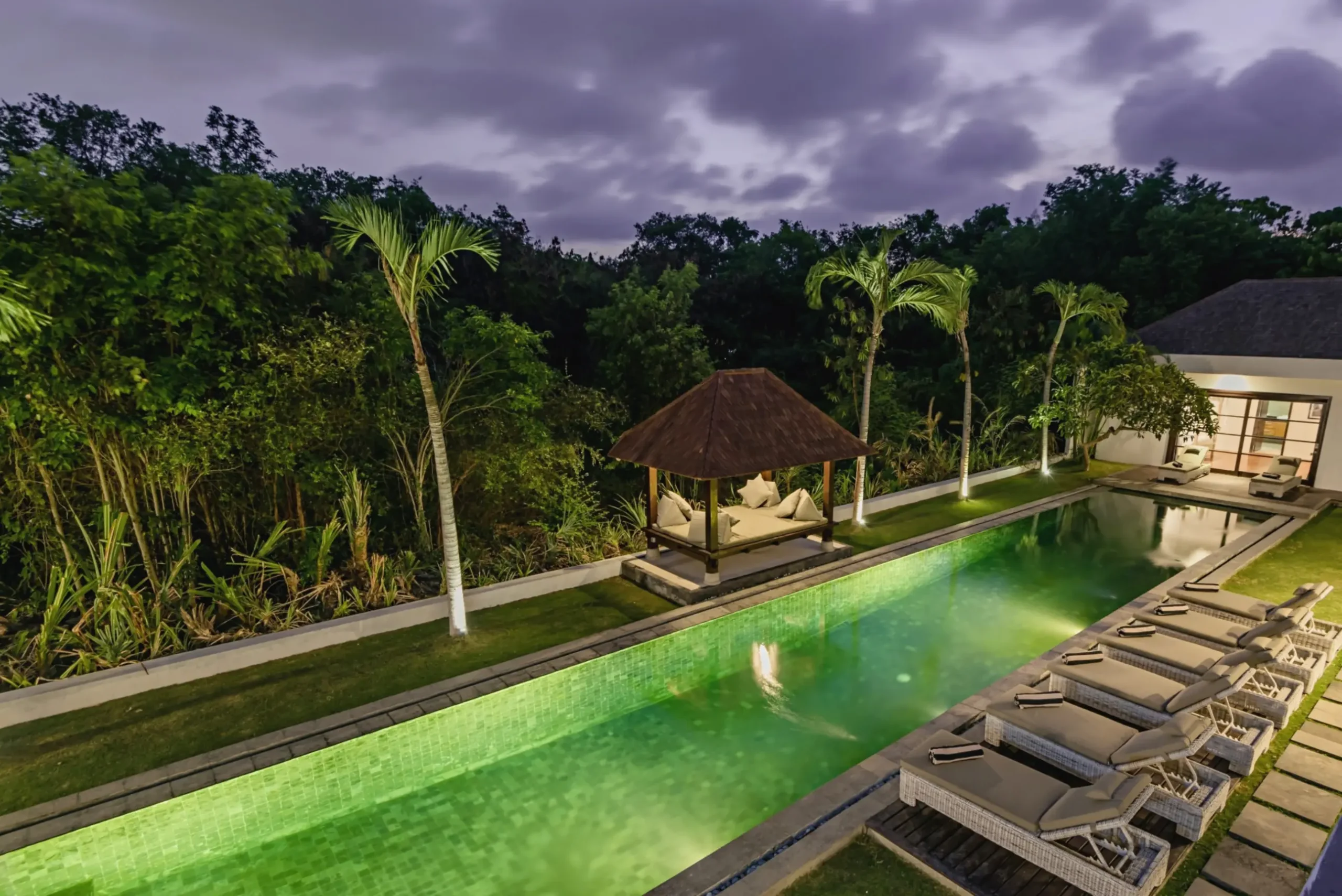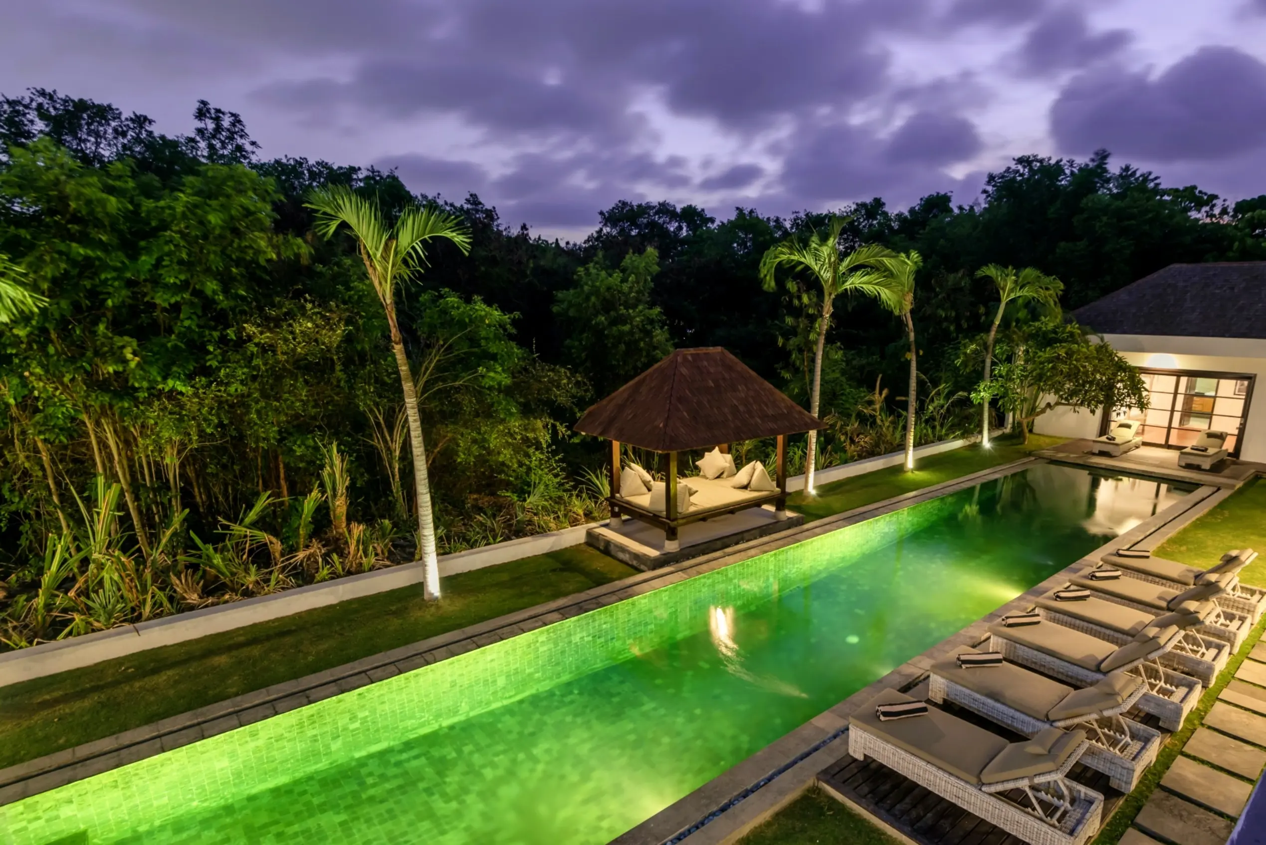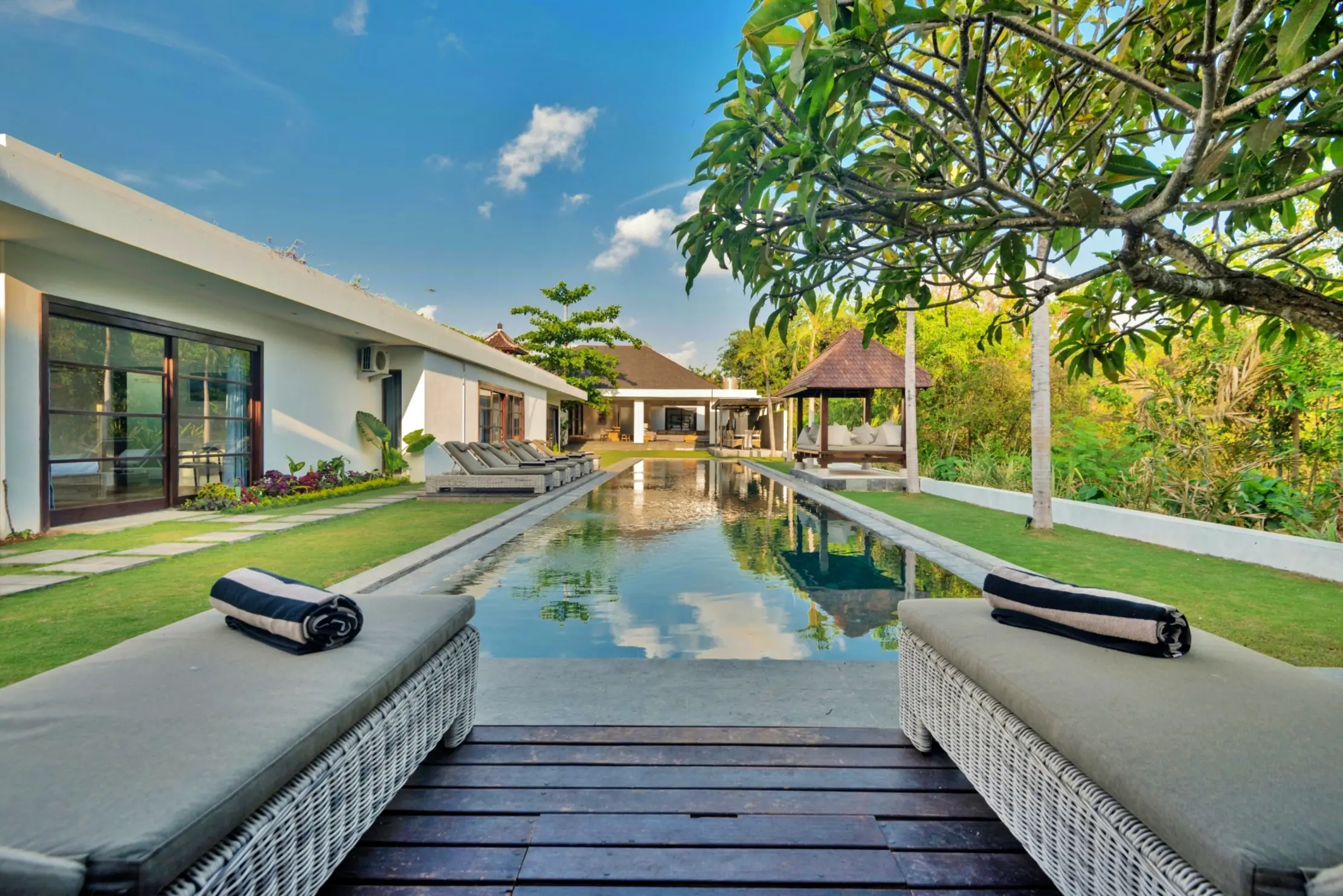 Close to world class beaches, shopping, eating and nightlife with some of Asia’s best restaurants, bars and nightclubs offering great value for your money. The villa estate has flexible accommodation with 11 bedrooms and 14 beds with air conditioning, 10.5 bathrooms with high quality vanity units/fixtures & fittings. There’s a large living, dining and entertainment area leading with a separate kitchen. A large swimming pool (child & non-swimmer friendly) is situated in the lush tropical garden area along with outdoor daybeds, entertaining and BBQ area. A BBQ is available for use.