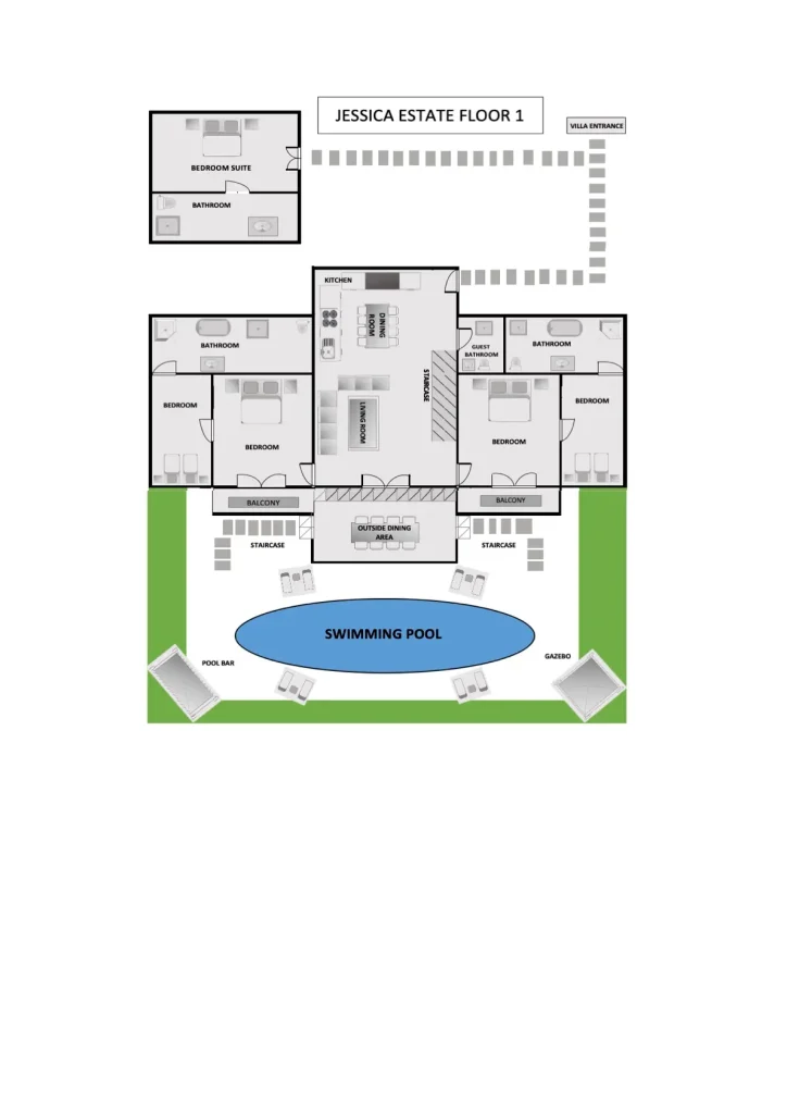 This beautiful villa estate offers 9 comfortable bedroom suites consisting of